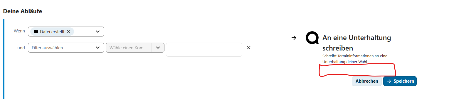 seid dem Update auf NC 32 kann ich unter “Persönlich” in dem Ablauf "An eine Unterhaltung schreiben keine “Zielunterhaltung” mehr auswählen. Sprich die Möglichkeit ist einfach nicht mehr da.