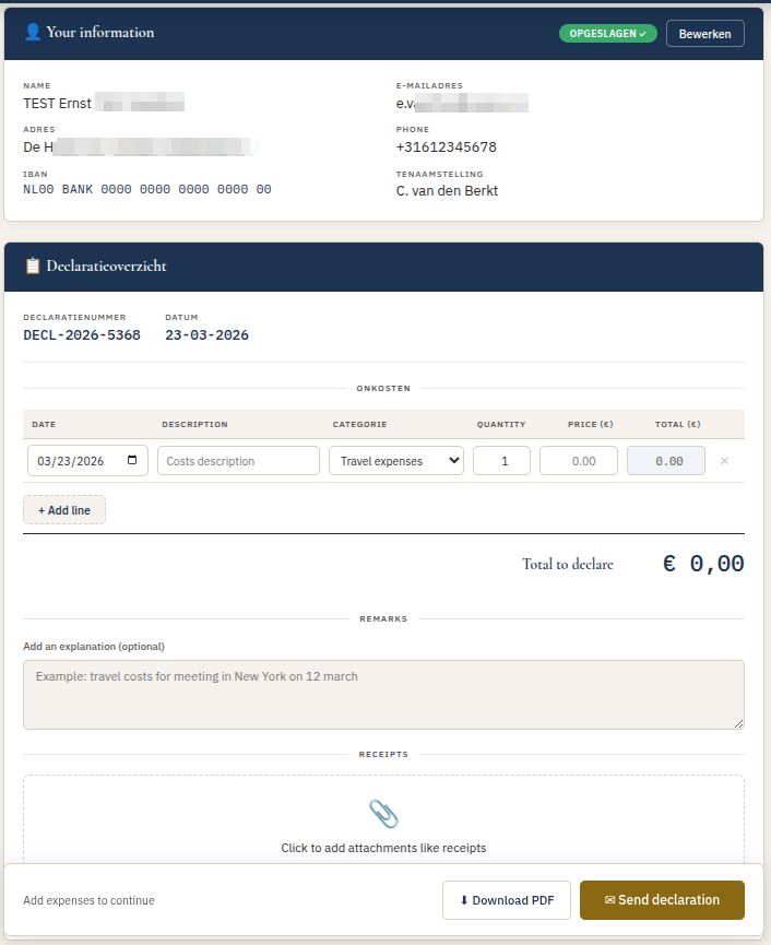 For a non-profit organisation, I’m looking to make declarations easier. Currently, the volunteers have to write on paper there expenses like mileage, lunch, public transportation costs. This, along with there bank accounts, is then given to the finance volunteer.