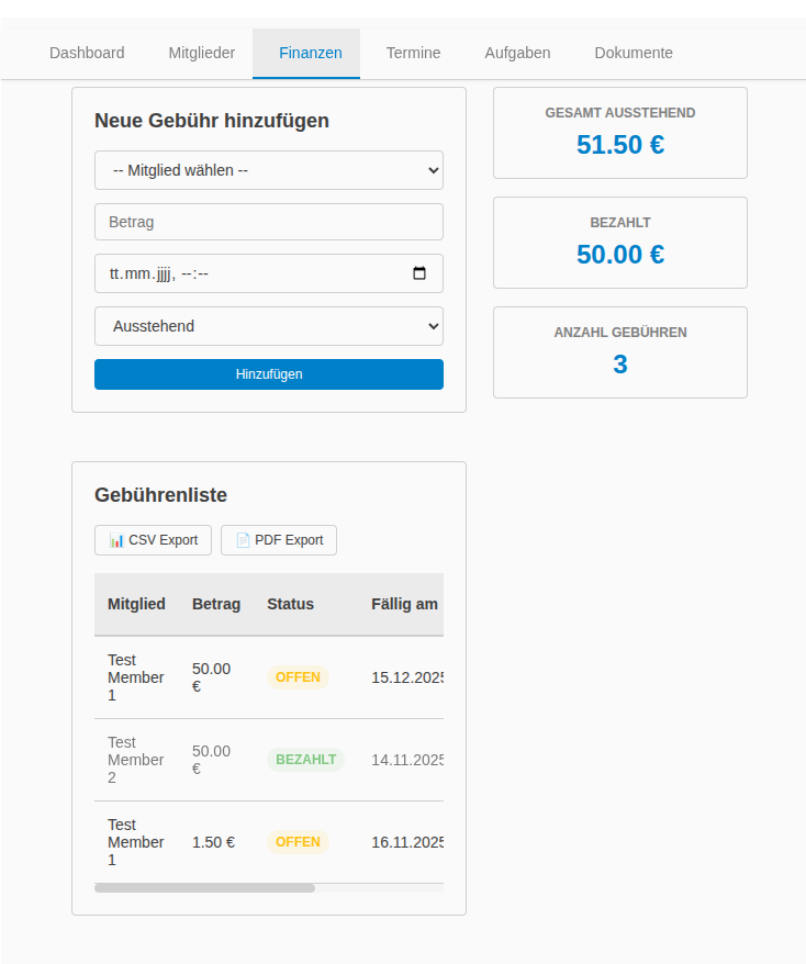 **PDF-Export** fĂŒr Rechnungen und Mitgliederlisten