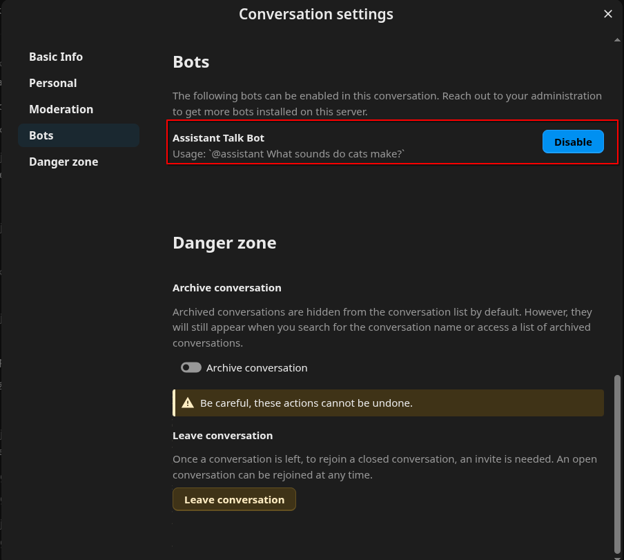 Only the Assistant Talk Bot in conversations is completely inactive.