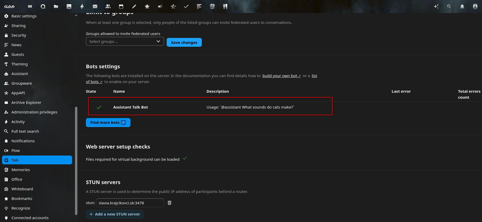 The bot appears normally in Talk settings under Bots, and I enabled it inside a conversation —