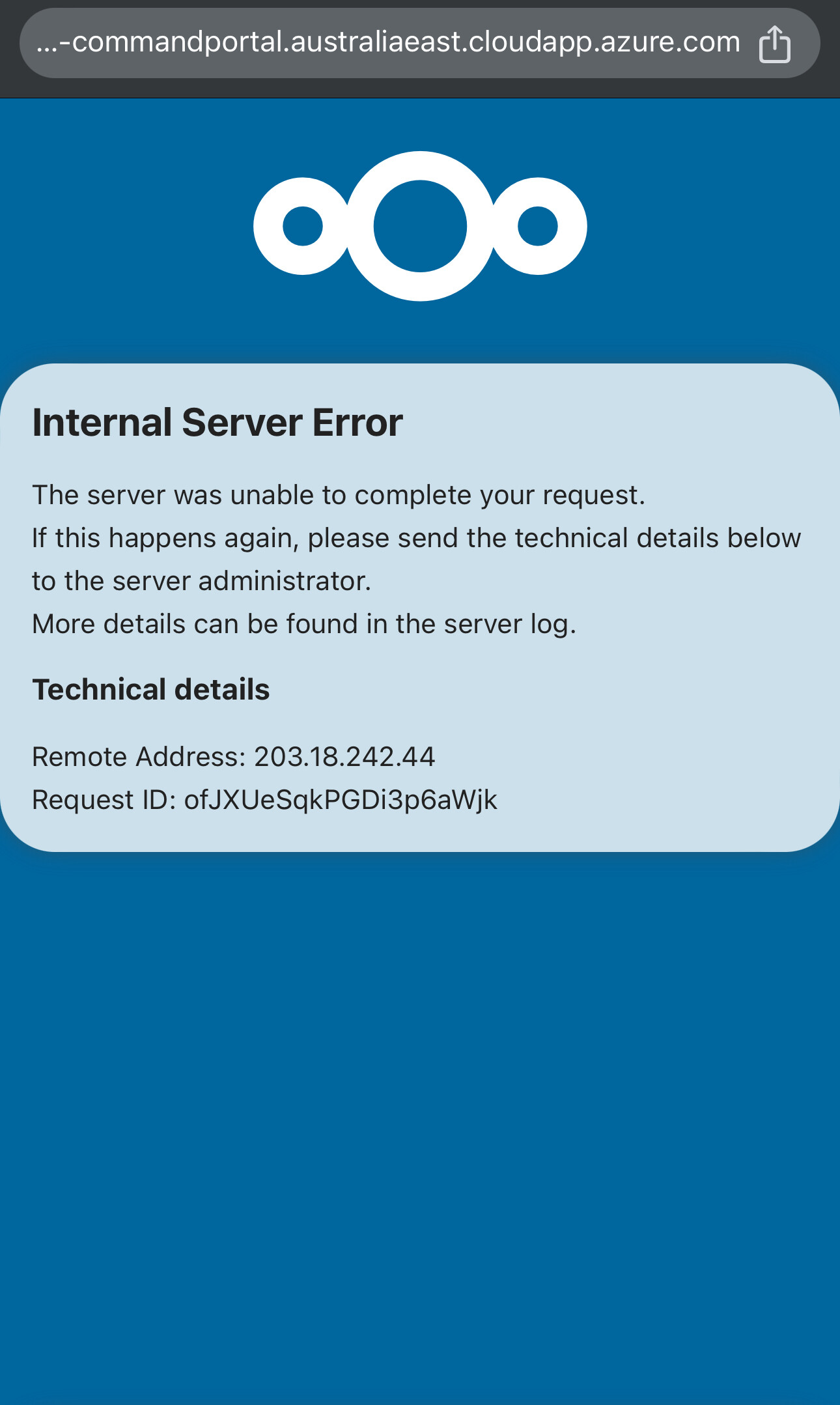 I’ve just gone in to access the instance via the DNS url as well as Public IP. I’m currently getting an error message on multiple browsers when trying to access the portal - although it is still working perfectly fine within the NextCloud iOS app.