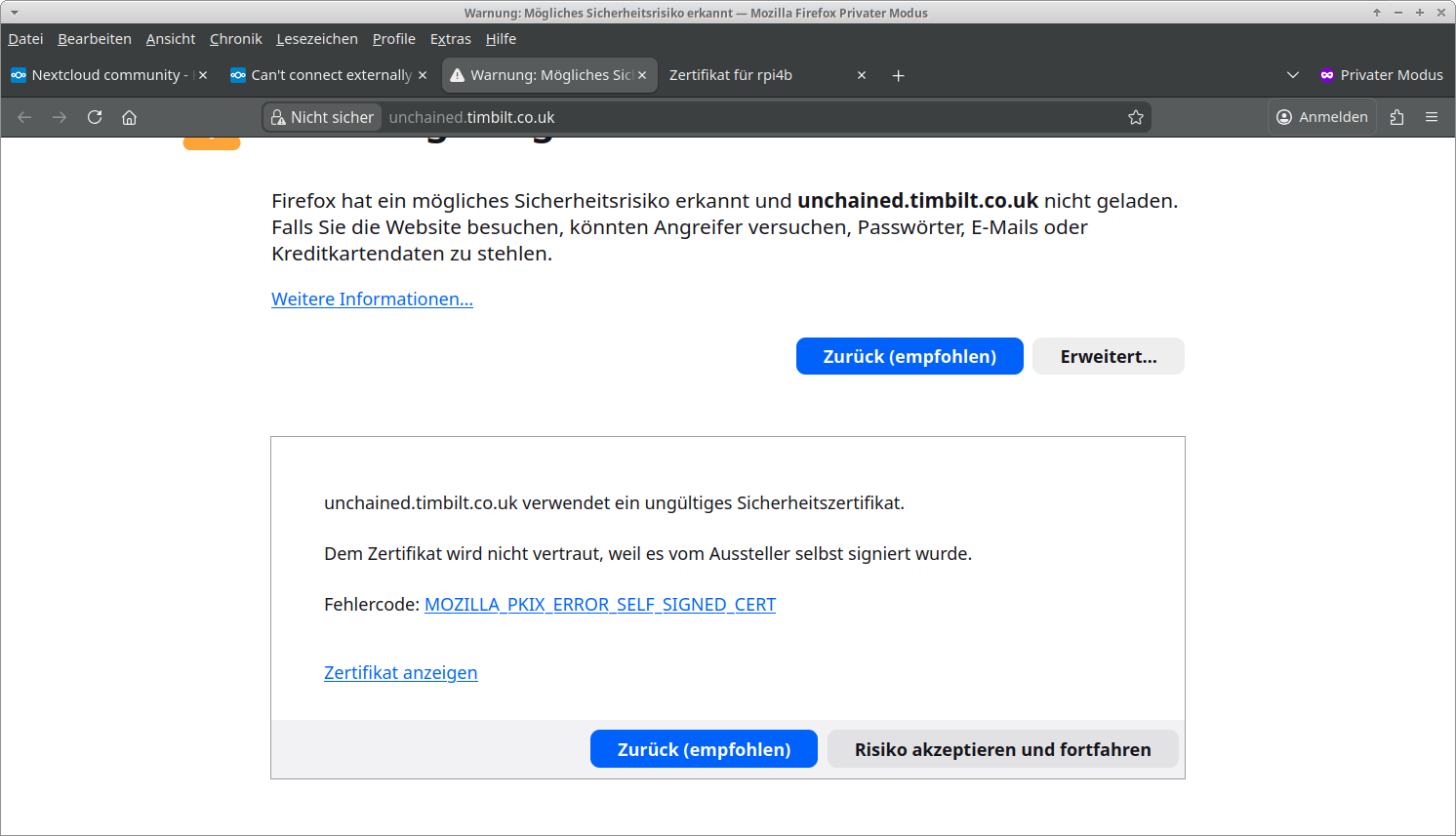 Having failed to get Nextcloud to run on a Virtual Machine, I’m now failing on a Raspberry Pi4 instead! This seems crazy hard to get work!
