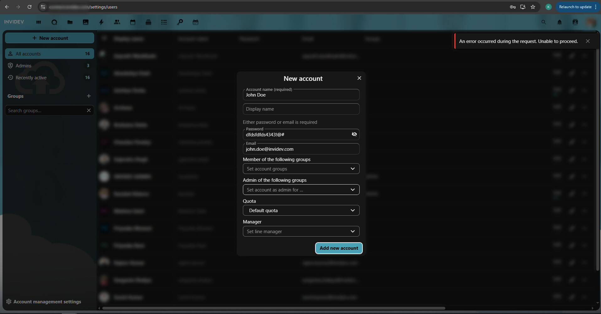 I have Nextcloud Hub 25 Autumn (32.0.2) installed on my server. I am getting an error after submitting the Add User Account form. The error says: