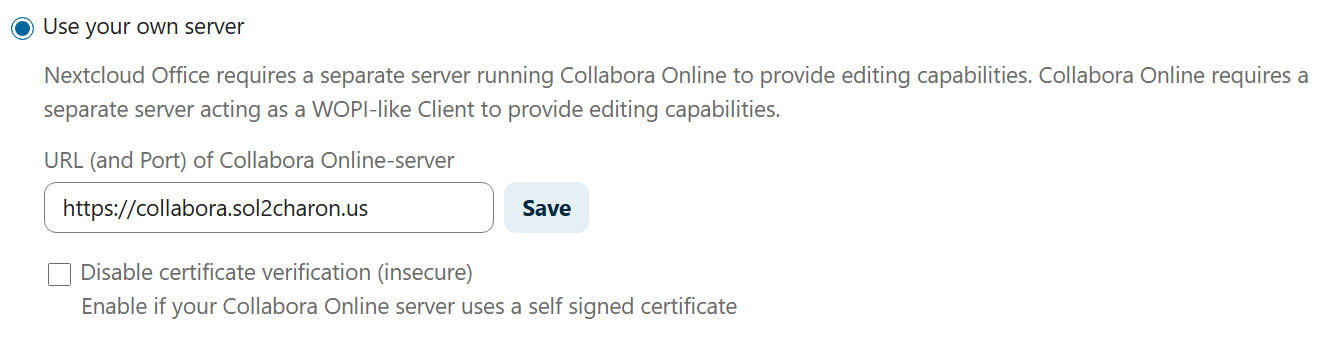 I have been slowly attempting to resolve all of the installation issues, this is the biggest. I have collabora installed in a separate container on docker BUT using the same nextcloud_network. Collabora is returning OK in the browser when I reach it using https://collabora.sol2charon.us. When I go to the User > Administration Settings > Administration > Office I get