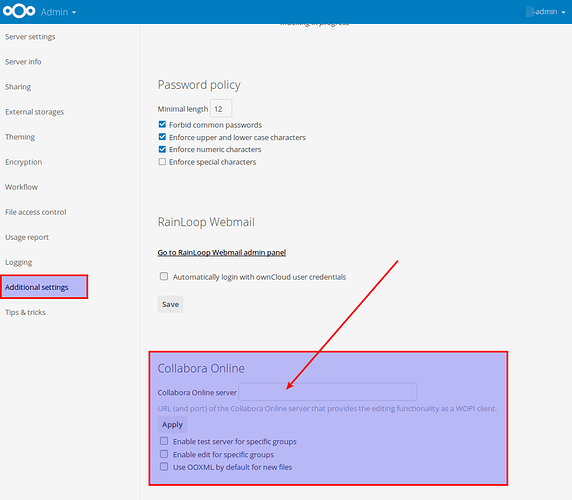 I’ve just installed the collabora online app (and the docker container) but the administration part of the app seems to be missing.