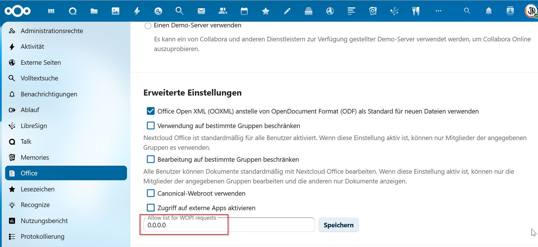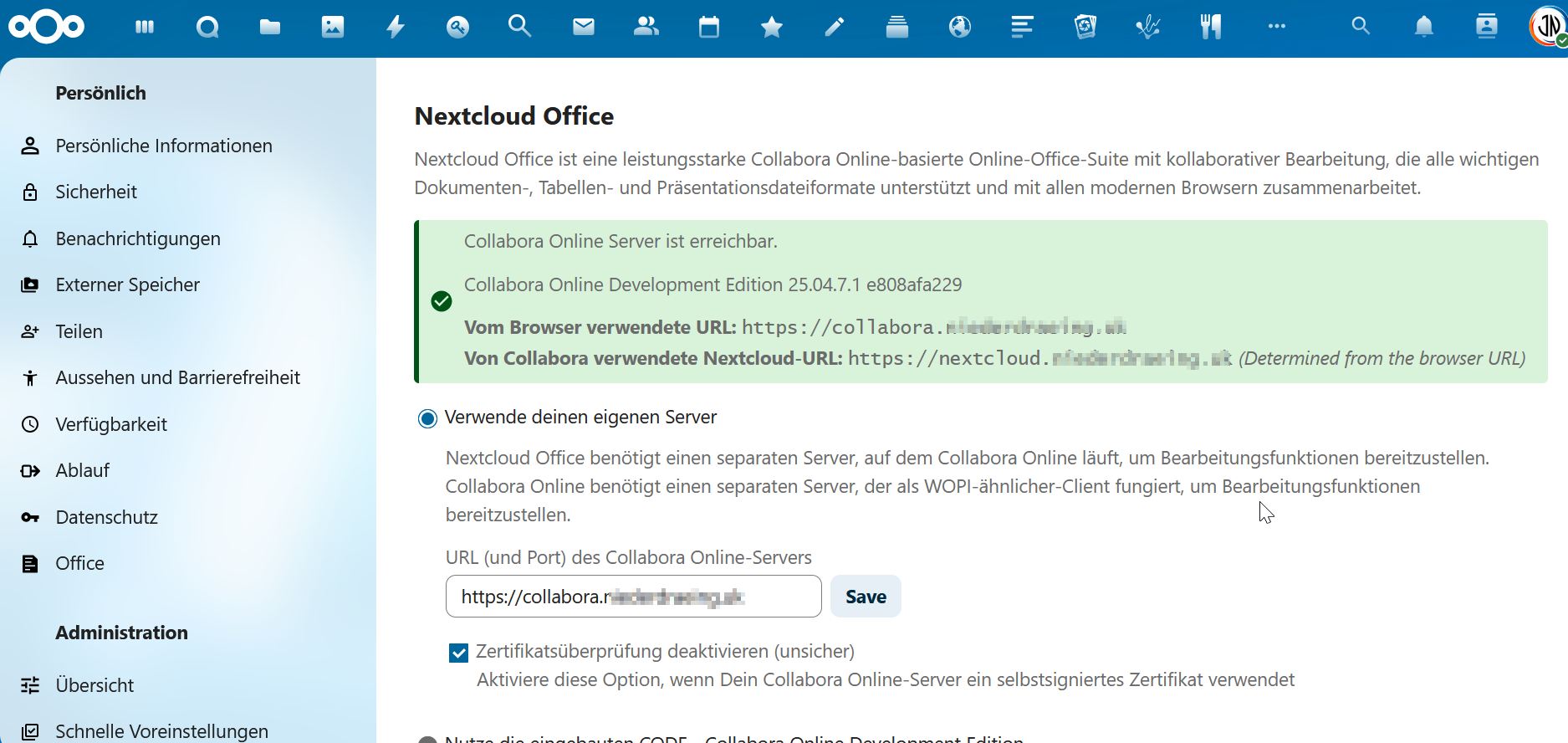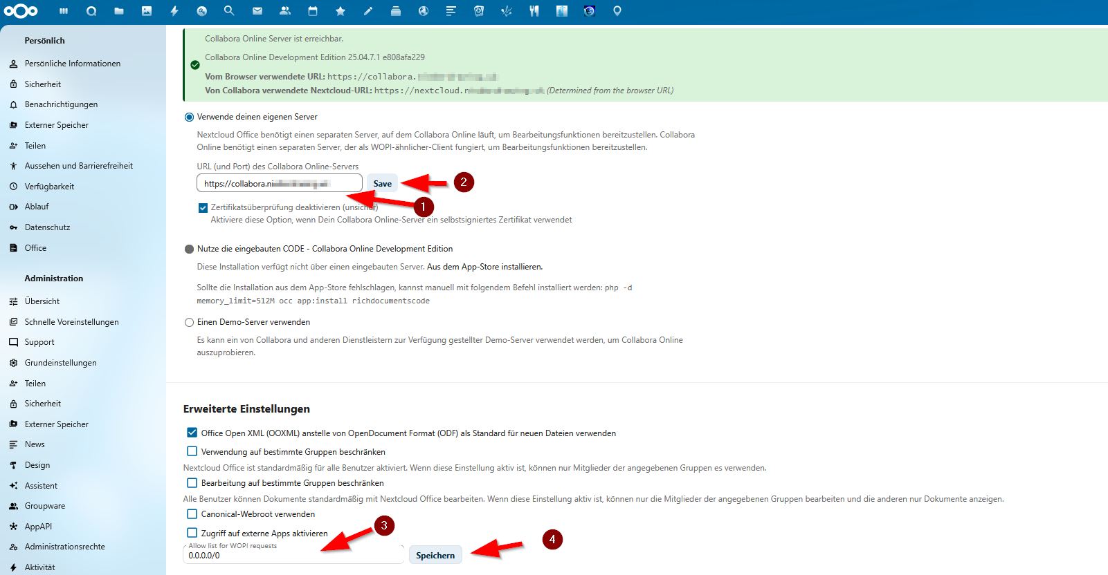 I’m having trouble setting up a Collabora Docker container in Nextcloud. I’m running Nextcloud, NGINXProxyManager, and Collabora on Proxmox (9.0.11)/Docker LXC Containers (Debian 12.12). All three applications are running as individual containers. The NGINXProxyManager is the reverse proxy for the applications’ external access. I believe I’ve configured Collabora correctly because when I access it through the reverse proxy, I get an “OK” message in the browser. However, when I try to open a Word document via Nextcloud, I get the following error message: “Failed to load document. Unauthorized WOPI host. Please try again later and contact your administrator if the problem persists.” I’ve read quite a bit but haven’t quite grasped what a WOPI host is. Does anyone have any idea what I need to configure and where?
