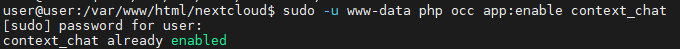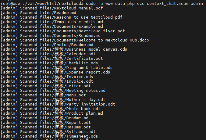But when this time I try to scan my folder use this command “sudo -u www-data php occ context_chat:scan admin”, its show me works fine, everything can index.