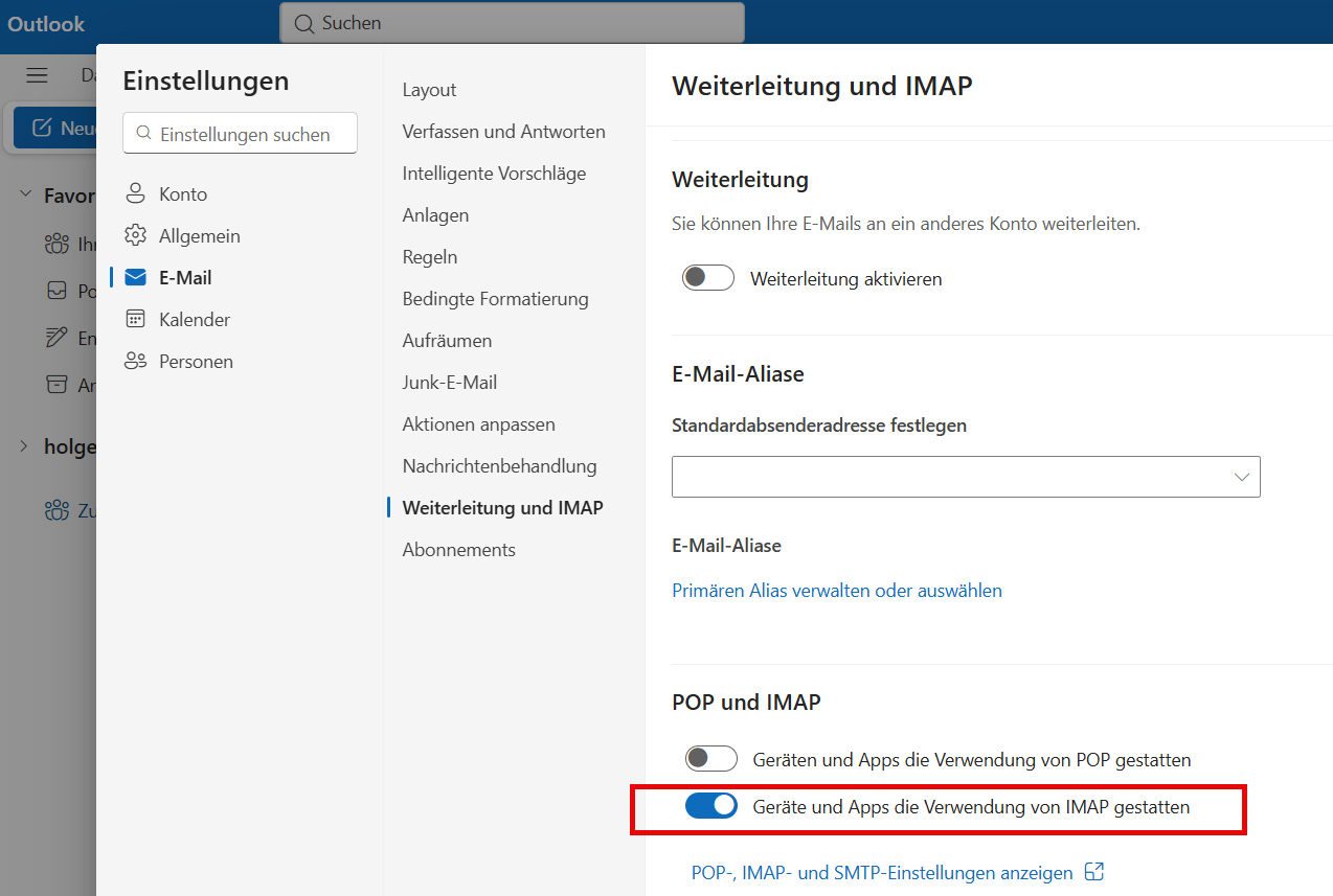 Im Online-Konto ist alles richtig gesetzt: Apps und Geräte dßrfen per IMAP verwenden.
