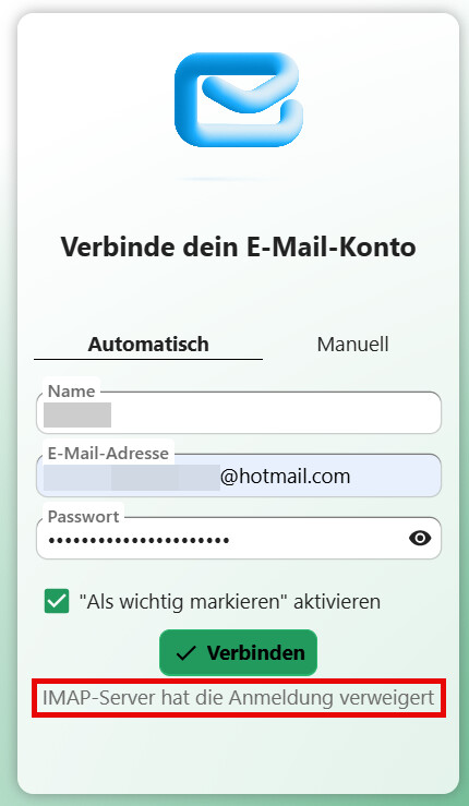 Probleme bereiten mir allerdings meine beiden Hotmail-Konten. Diese lassen sich mit der Fehlermeldung âIMAP-Server hat die Anmeldung verweigert.â