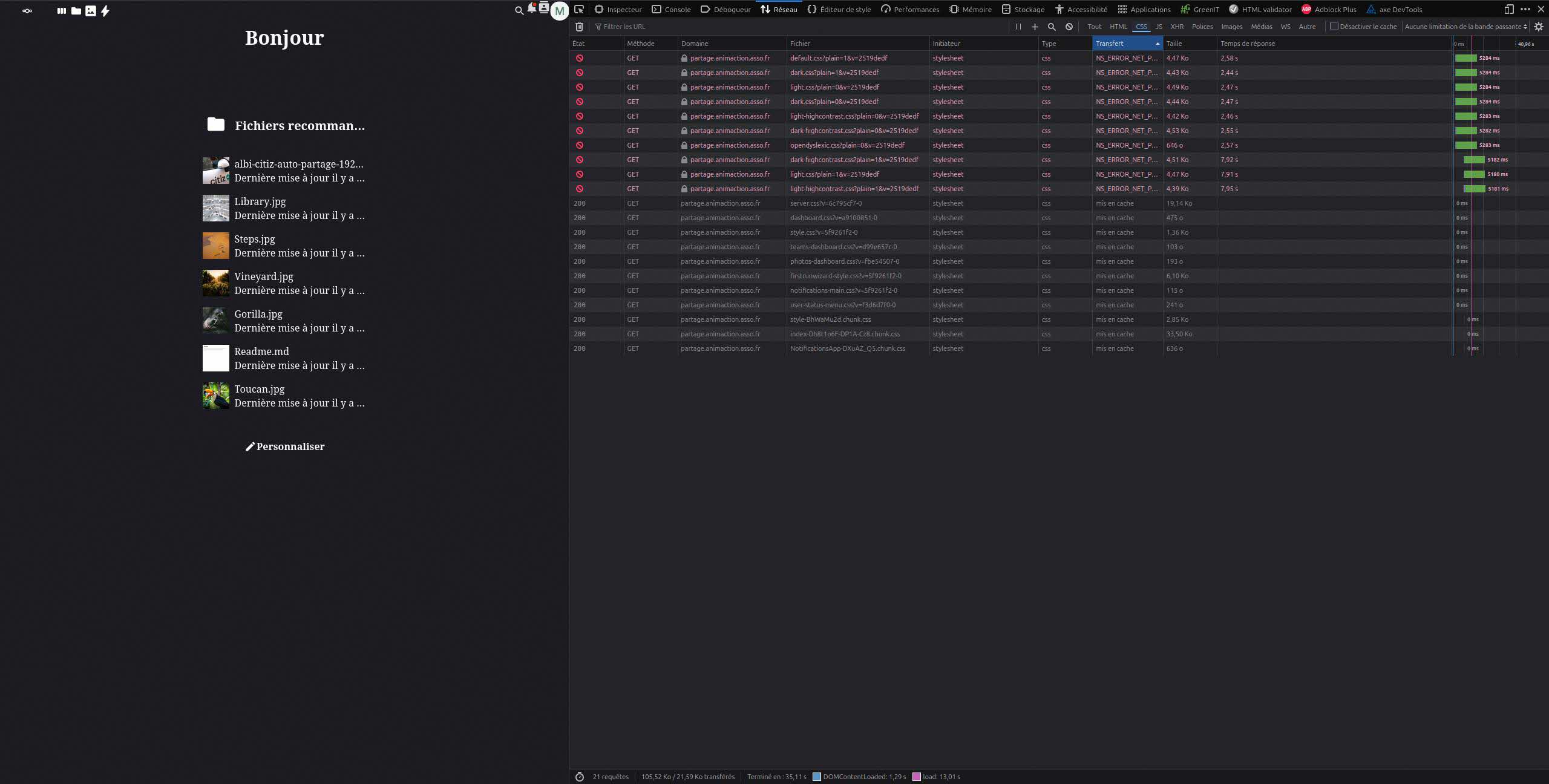 En consultant la console du navigateur, je constate que Le message NS_ERROR_NET_PARTIAL_TRANSFERT apparaĂźt sur 10 feuilles de style et que chacune dâelle Ă un temps de chargement supĂ©rieur Ă 5000ms.