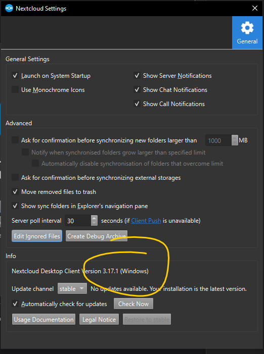 Where can I find the version of the Nextcloud client installed and used? There seems to be no about or help menu showing version.