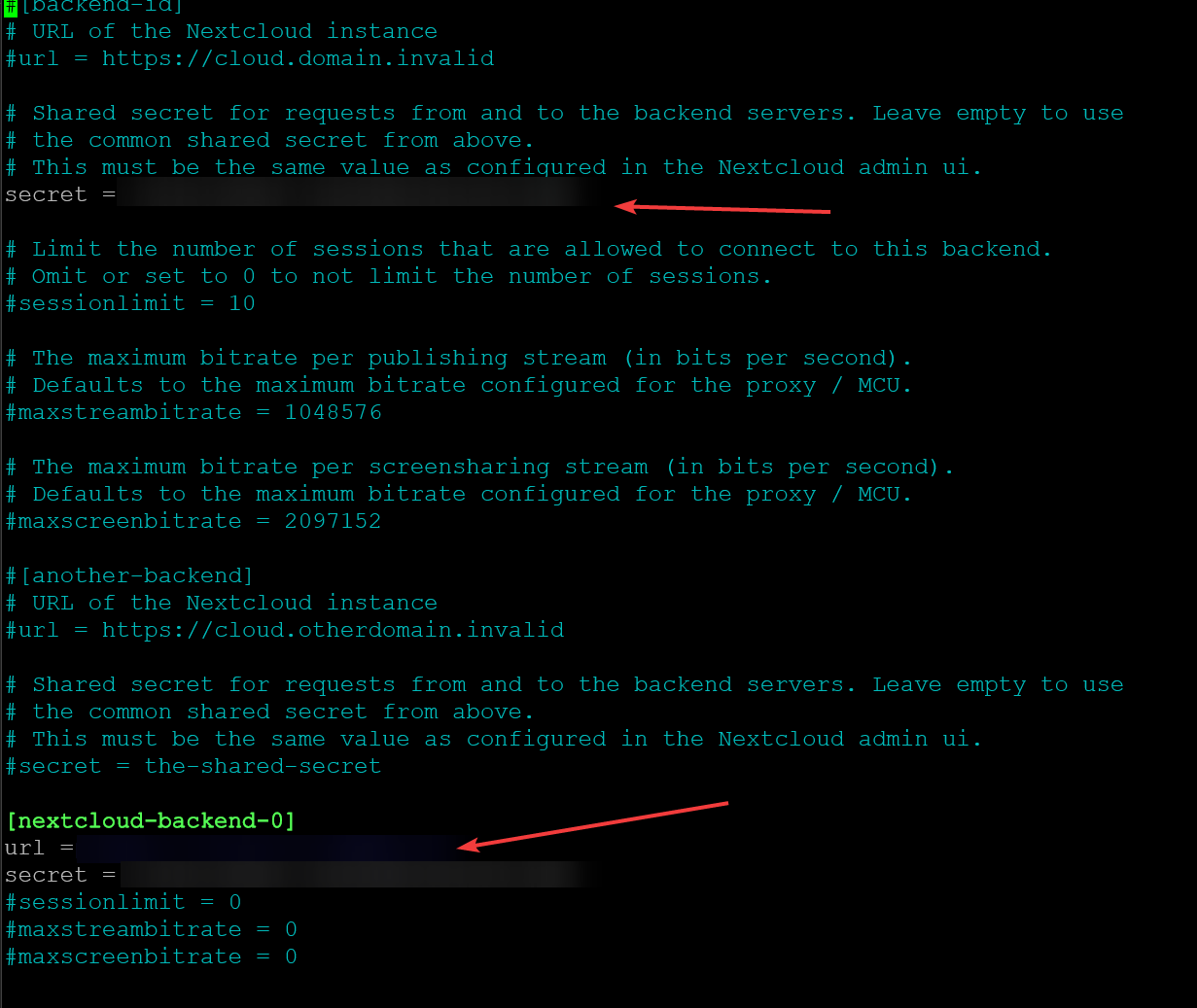 Cause: The [backend] section in /etc/nextcloud-spreed-signaling/server.conf had an empty secret field, while Nextcloud had a shared secret correctly configured on its end. This mismatch caused all backend requests from Nextcloud to be rejected by the signaling server.