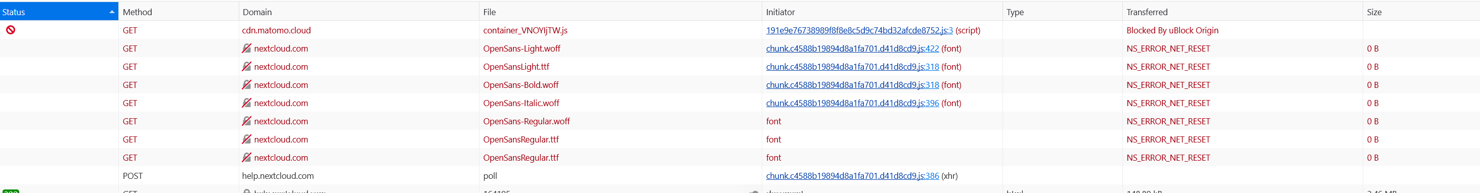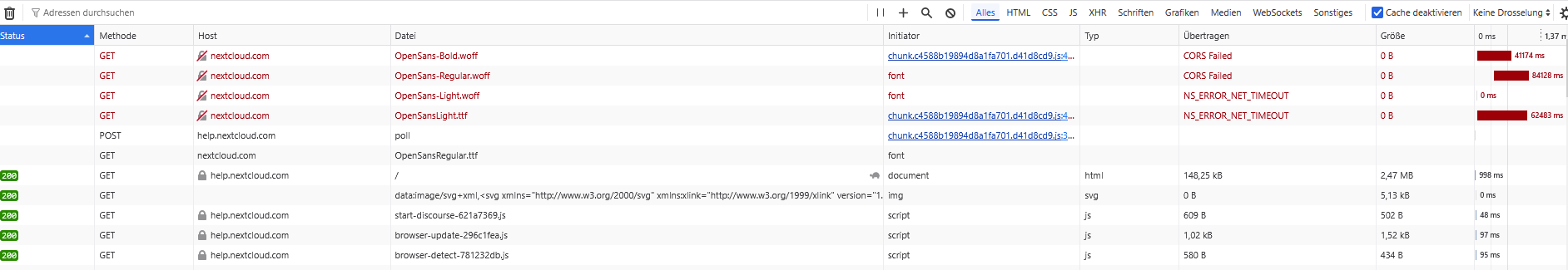 It has improved a bit, however when using through my own server as proxy (same hosting company like Nextcloud), I get these NS_ERROR_NET_TIMEOUT errors on the fonts, and the regular nextcloud.com website cannot be loaded either: