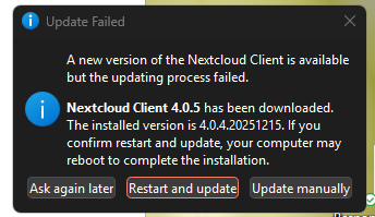 The Nextcloud Client for Windows attempts to install an update clicking Restart and Update on the following screen just comes back with the same dialog.