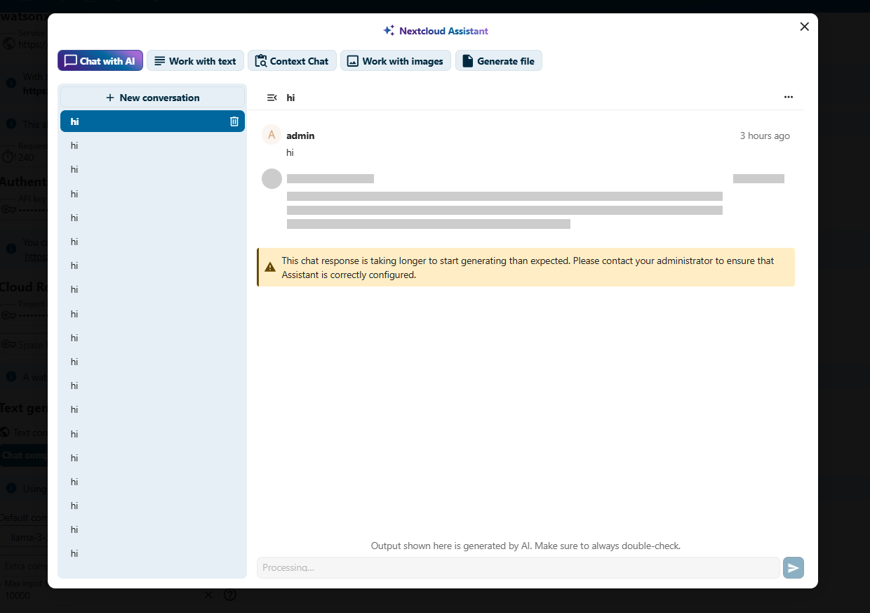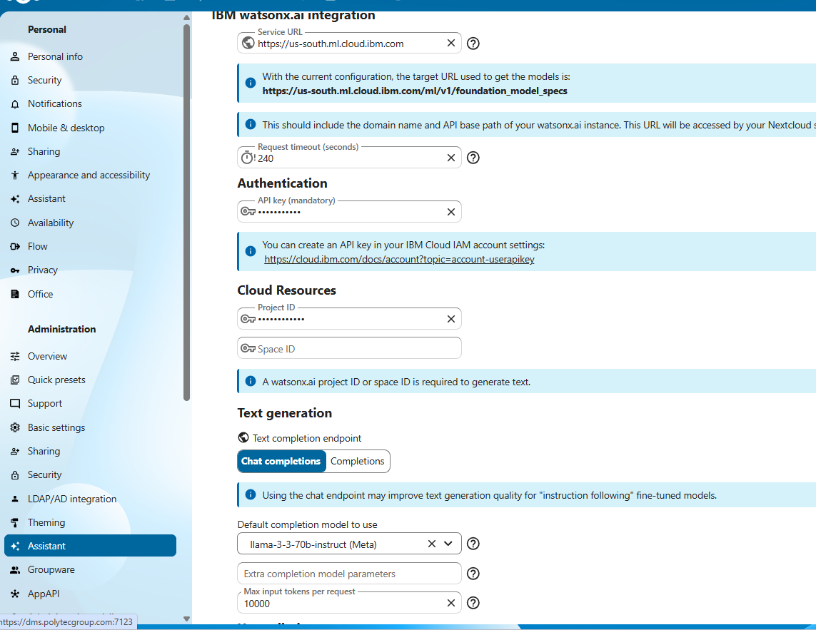 I have installed the IBM watsonx.ai integration in my self-hosted Nextcloud. However, the AI chat feature does not work at all.