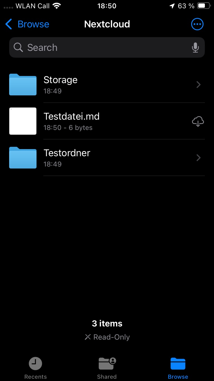 Auch wenn ich mir in der iOS-Nextcloud-App einen neuen Ordner erstelle und dann unter iOS darin eine Datei erstelle, funktioniert das problemlos. Es ist wirklich nur in dem Wurzelordner meines Benutzers.