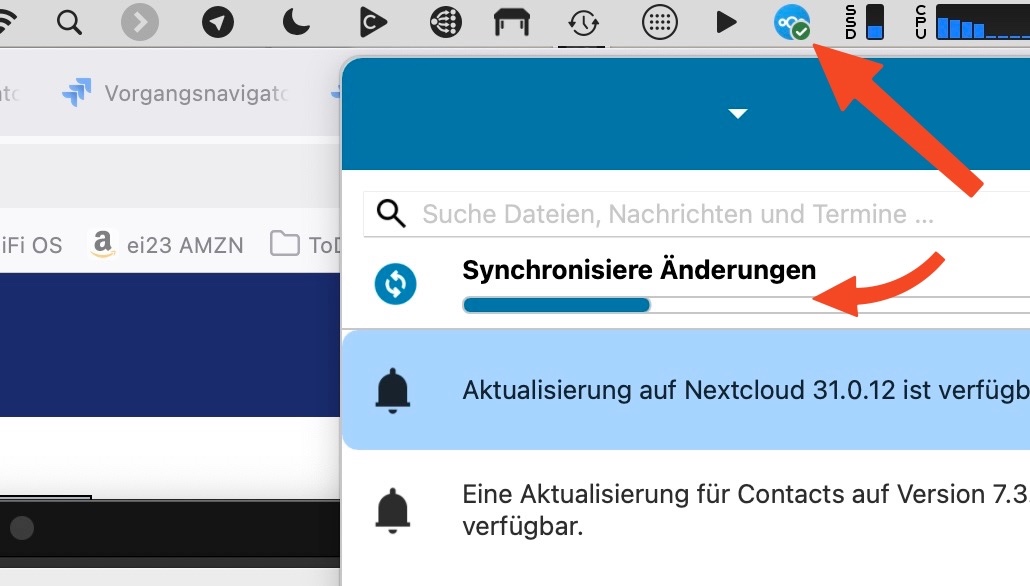 Progress bar is visible in the Nextcloud client. Save again while it’s still active. Synchronisation freezes. The menu bar icon shows “done”, while the progress bar does not progress.