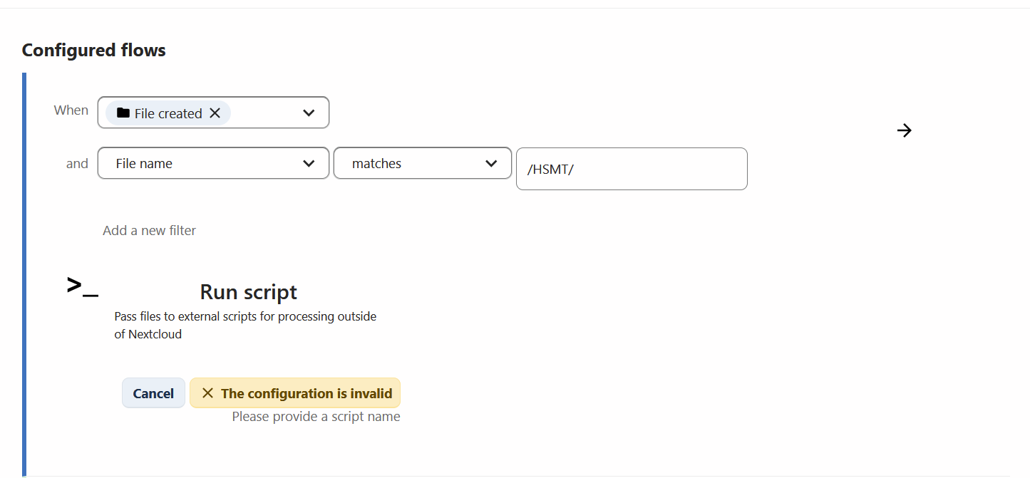 I want to set up a Flow using the Workflow Script app so that Nextcloud will run a shell script when a file is created or updated.