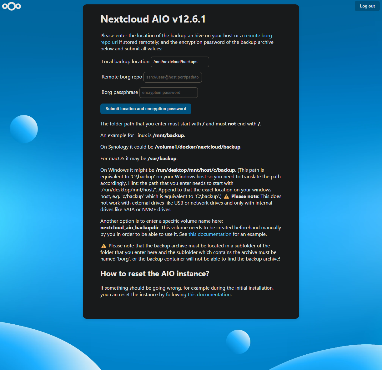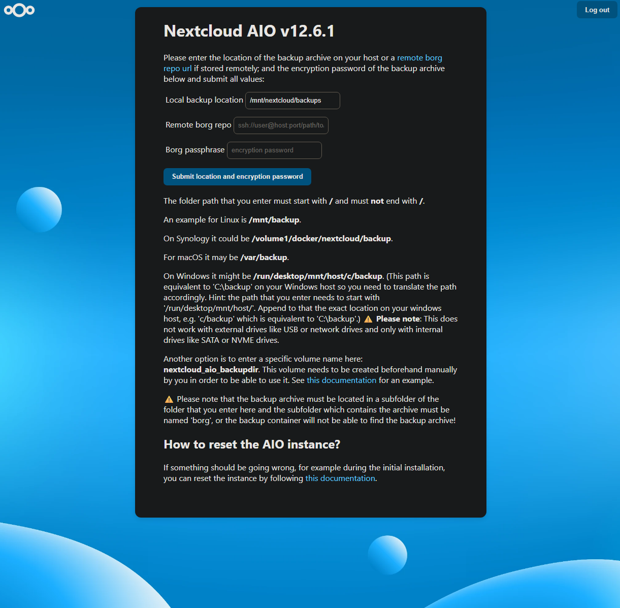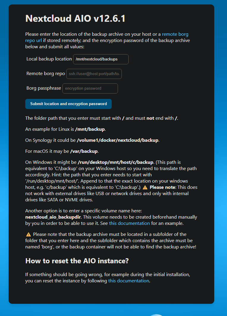 Then when I logged in, it asked me to either create a new instance or to restore from backup. I tried to restore, it found the backups fine, and I had saved the password so it all worked. I verified the backup and then restored. But after it was done restoring, it just showed me the same “Restore Backup“ screen I previously filled out. I’ve tried restarting the container, the system, and just continuing to restore from backup. It doesn’t ever get past this. Maybe I am doing something wrong. The backup was made with AIO v12.5.1, and the update changed it to 12.6.1. I assumed I’d be able to restore just fine, but it seems like either I messed up the process or misconfigured something. I do have a snapshot of the VM from just before updating as well, so I can revert back to the old version, but I can’t actually start Nextcloud AIO v12.5.1, as the only button available for the services is the update button.