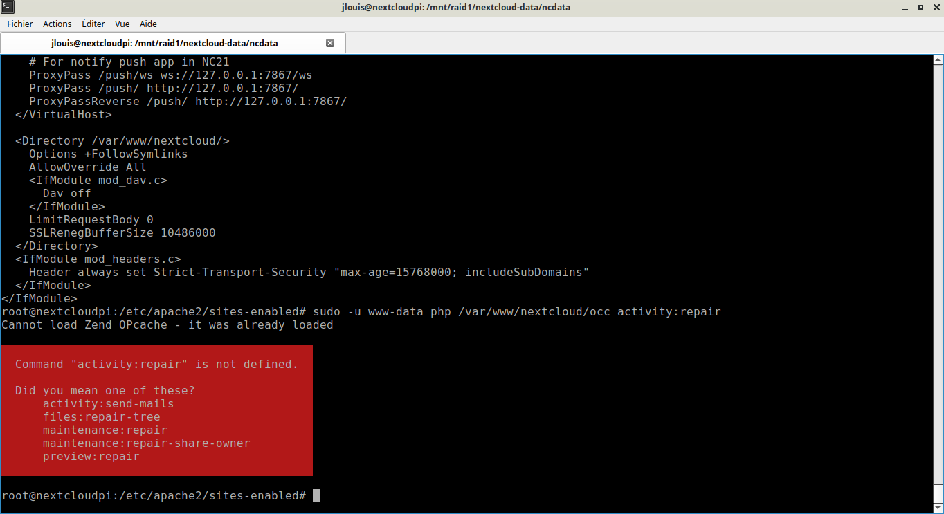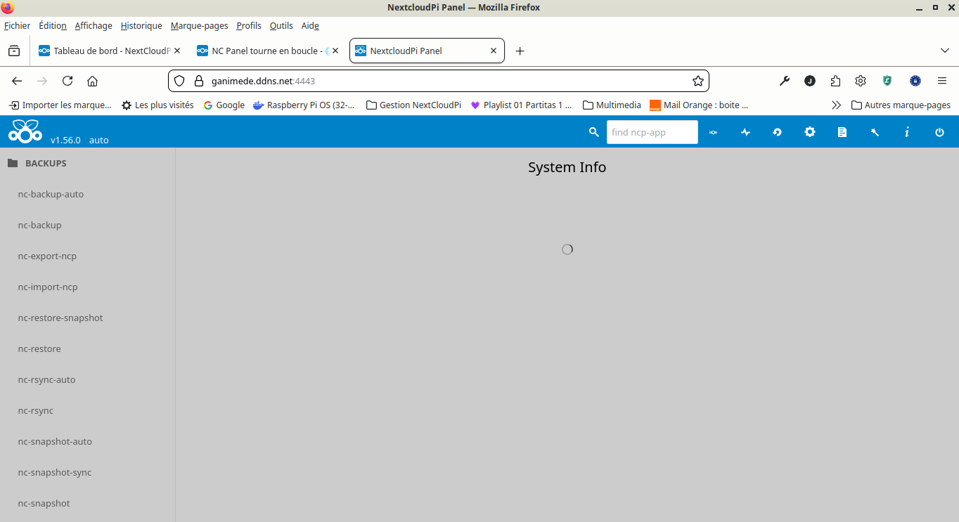 Ma configuration fonctionne sur un RaspberryPi5, Une SDcard de 32Go et 2 disques durs de 4To montĂ©s en grappe RAID1 pour les donnĂ©es nc-data. Je rencontre un petit problĂšme sur la partie ncp Panel. Je ne saurais pas trop dire pourquoi (âŠ). Jâai voulu rajouter un nom de domaine et câest la derriĂšre chose que jâai pu faire depuis lâinterface graphique du site. Des mises Ă jour Ă©taient Ă©galement proposĂ©es. Maintenant NextCloud Panel ne rĂ©pond plus. Il tourne en rond et tout est grisĂ©.