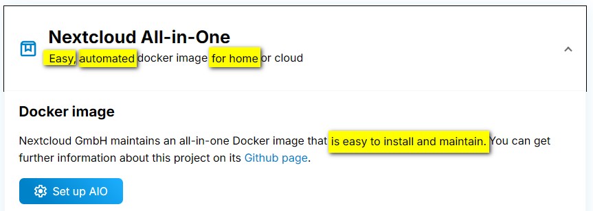 […]First try of installation of AIO on win 10. I follow NC guide but I’m not sure i understood every single step. Particularly, at some point the guide said to be sure to have already the folder “C:\your\data\path” but I was not sure if those were actual folders names or placeholders and anyway on my C:\ drive I didn’t have it. It also said to modify /host_mnt/c/your/data/path if I didn’t have it.