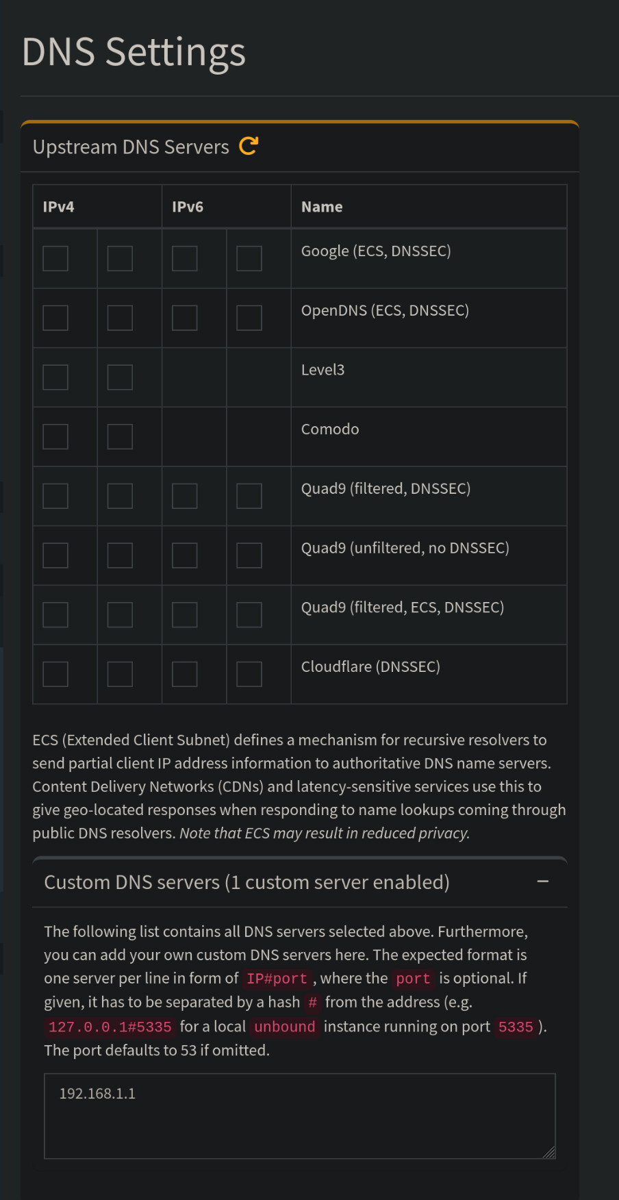 in Pihole DNS settings you will add your router’s IP as the DNS source for pihole and deselect all the others