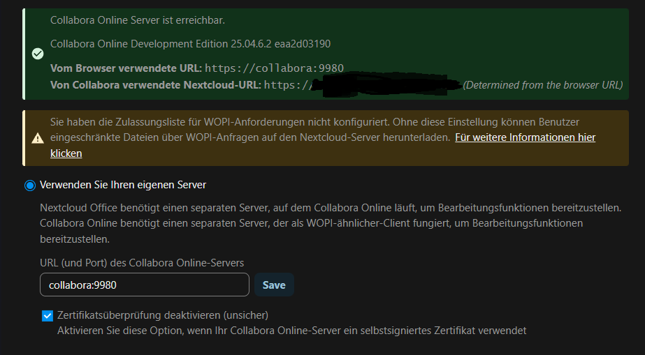 Nextcloud is already up and running, now I added Collabora. The Container is running and prompts that it is ready to accept connections.