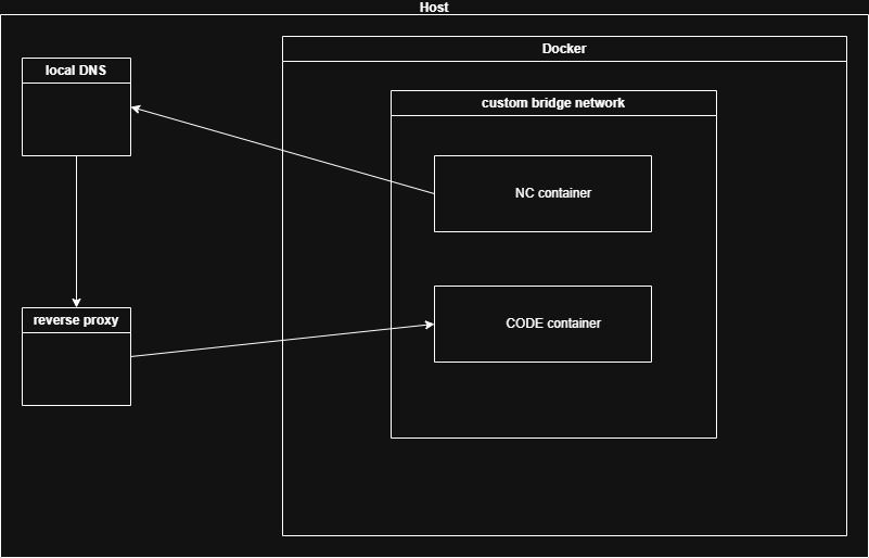 doesn’t look complete for me.. using a dns might result in issues - I never find motivation to troubleshoot but from my experience docker container on same host can’t talk to each other using external networking - probably one has to adopt iptable rules.. but maybe it works if reverse proxy runs on a separate host. your drawing would result in Nextcloud accessing CODE through hosts network (NC -> Docker Network -> host network -> reverse proxy -> CODE)