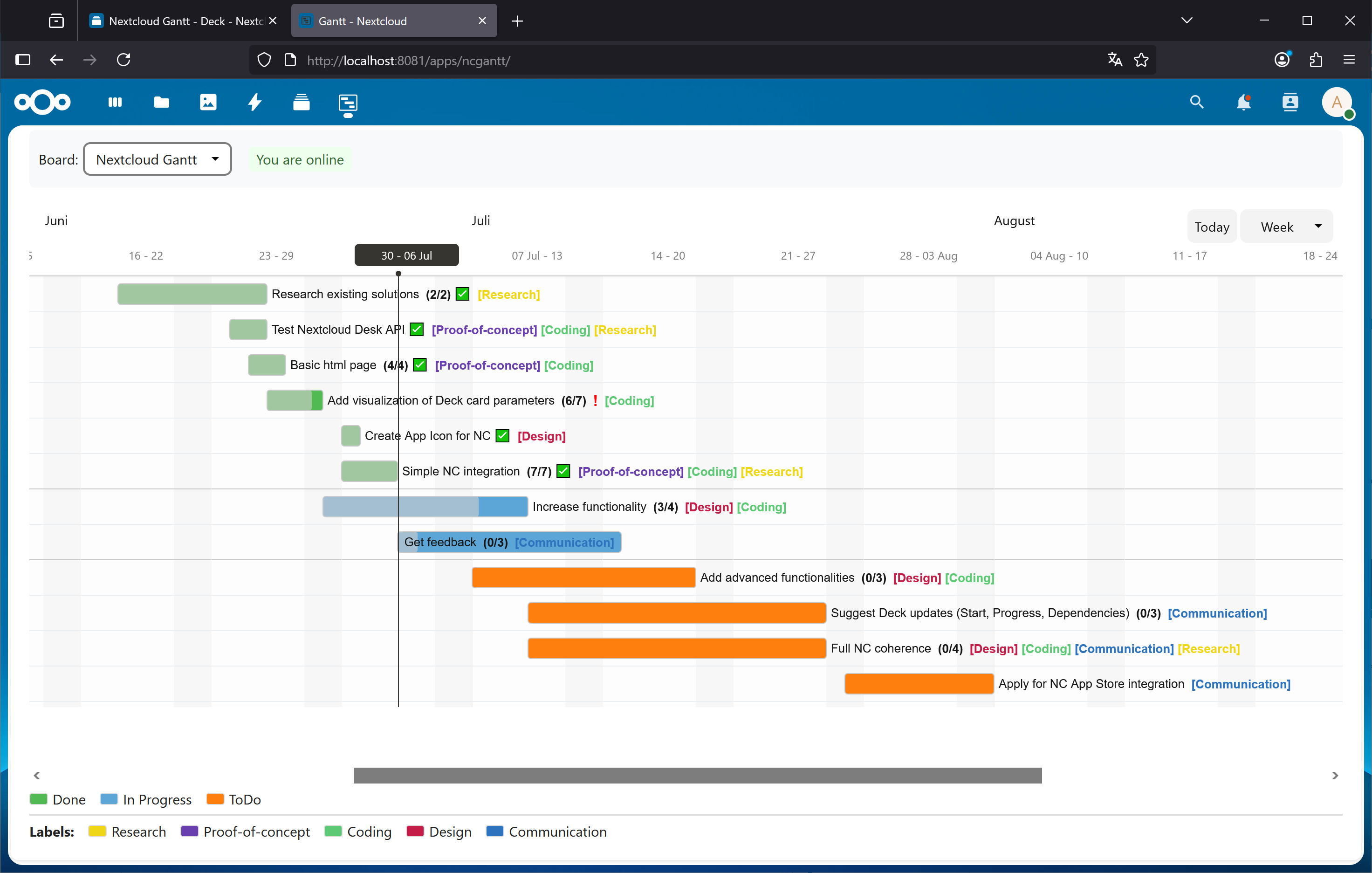 Hi everybody. I am also interested in a Gantt chart for Nextcloud since quite a long time, as I think this would fundamentally increase the usefulness of Deck. Is the management team mentioned above still active?