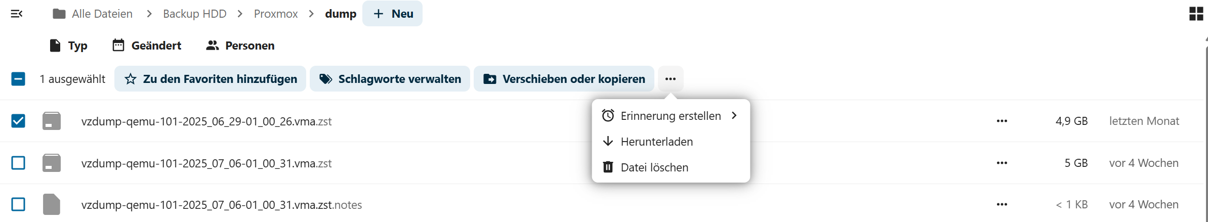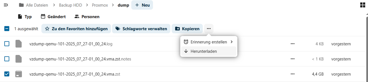 Von einem anderen Server werden dort regelmäßig Backup Daten abgelegt, dies geschieht mit dem User “jan” über SMB. Inhalt sind Images/Container aus Proxmox (Home Assistant, NGNIX und AdGuard)