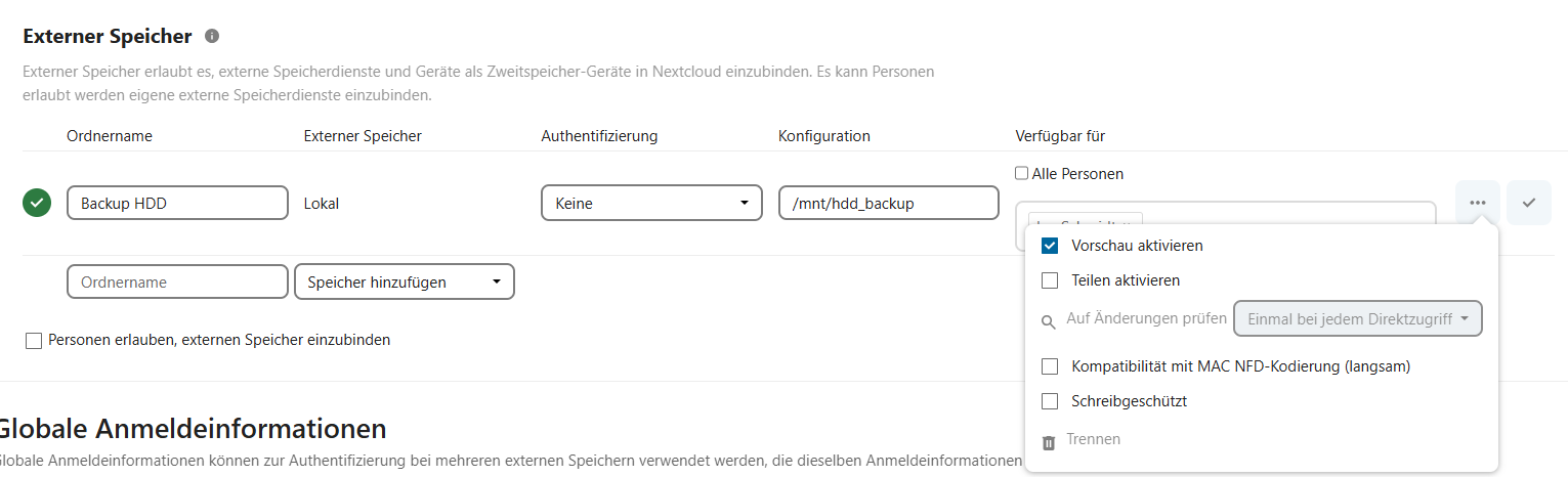 Ein MNT Volumen “hdd_backup” wurde als externer Speicher in Nextcloud eingebunden und einem Benutzer zugeordnet.