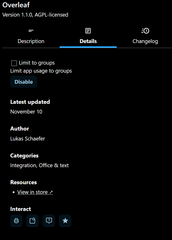 The one I was referring to is GitHub - Daniel-WWU-IT/overleaf-nextcloud: Overleaf integration app for Nextcloud. which is not published on the app store by the developer but would need to be installed manually.