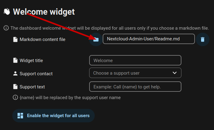 I’ve just tested it, and I’d say anywhere you want, respectively there’s a button in Settings > Administration > Theming > Welcome widget that lets you browse the file system of your Admin user and select any Markdown file you want.