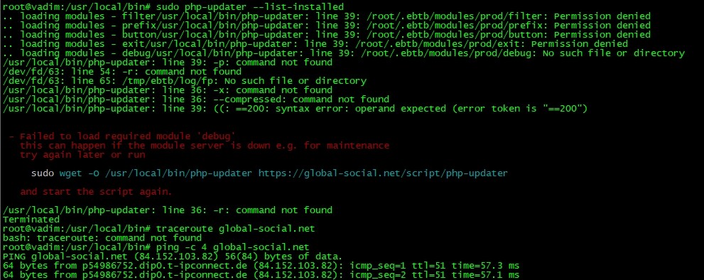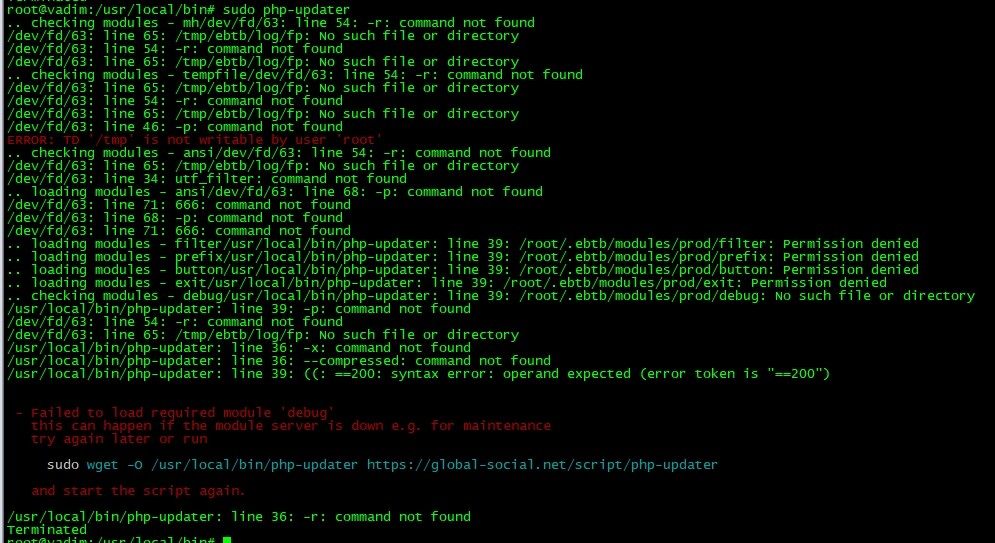 Thanks. Yes, internet access and DNS working fine. I know when I ran the initial wget command though from the Ubuntu host nothing downloaded - I just ended up with a zero byte file. I opened https://global-social.net/script/php-updater in Chrome manually and the script appeared inline immediately, so I copy/pasted that into the file in Linux. Didnāt think anything of it really, but when I run it with sudo, it just fails on loading the modules every time.