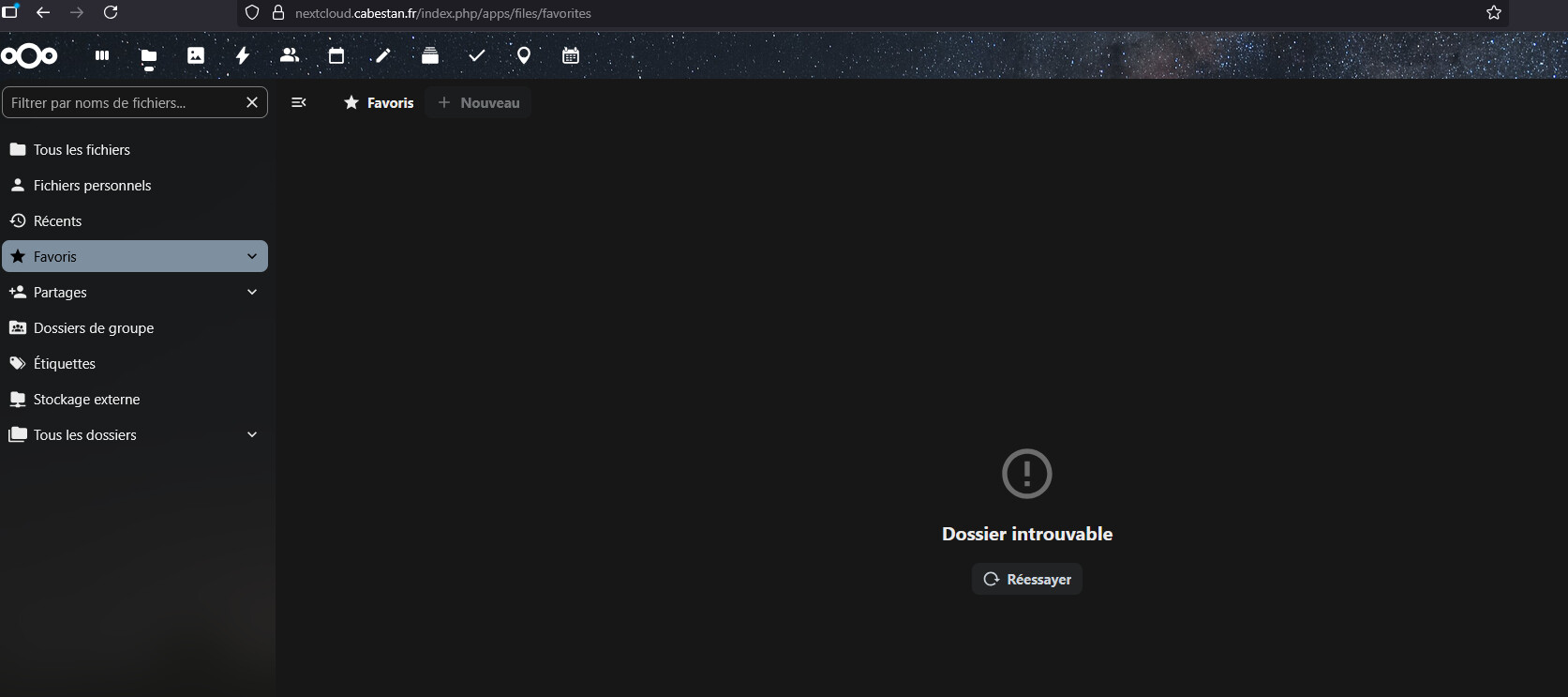 Lorsque je me rends sur mon onglet Favoris je tombe sur une page âDossier introuvableâ. En soi pourquoi pas si jâavais effectuĂ© une manipulation particuliĂšre mais je nâai a priori rien fait de cela. Jâai tentĂ© de rafraichir plusieurs fois.