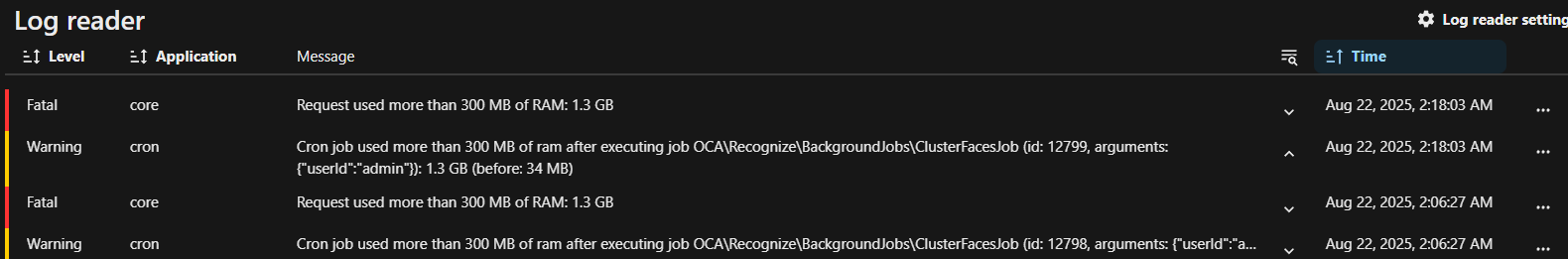When Recognize runs the Cluster Faces background job, it usually ends with the error “Cron job used more than 300 MB of RAM after executing job OCA\Recognize\BackgroundJobs\ClusterFacesJob.” While searching for the error, I tried setting the PHP_MEMORY_LIMIT and NEXTCLOUD_MEMORY_LIMIT environment variables to 2048 MB, but the error persists. Do you know what could be happening?