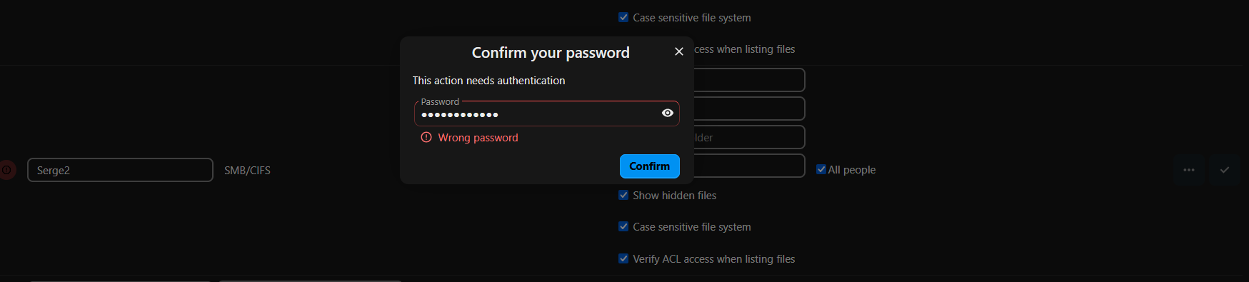 When adding an External Storage from the webui, it asks for my admin password, wich I type, but it returns as wrong password. It is the right password, it works in other categories.