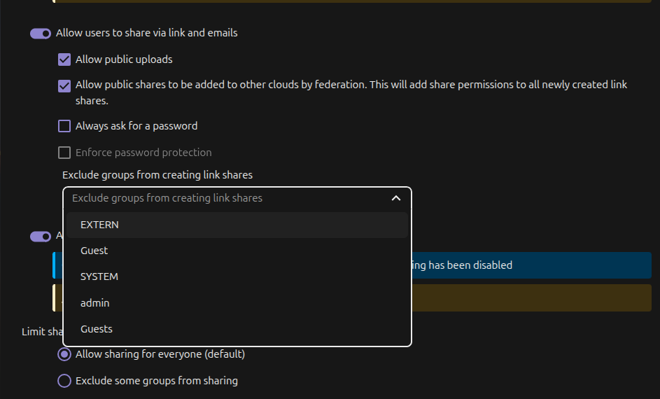 I see in the admin console >sharing that I can exclude groups from creating link shares but unlike the “limit sharing based on groups” I cannot select a group to allow in the “Allow users to share via link and emails”. I assume this is the public sharing feature.