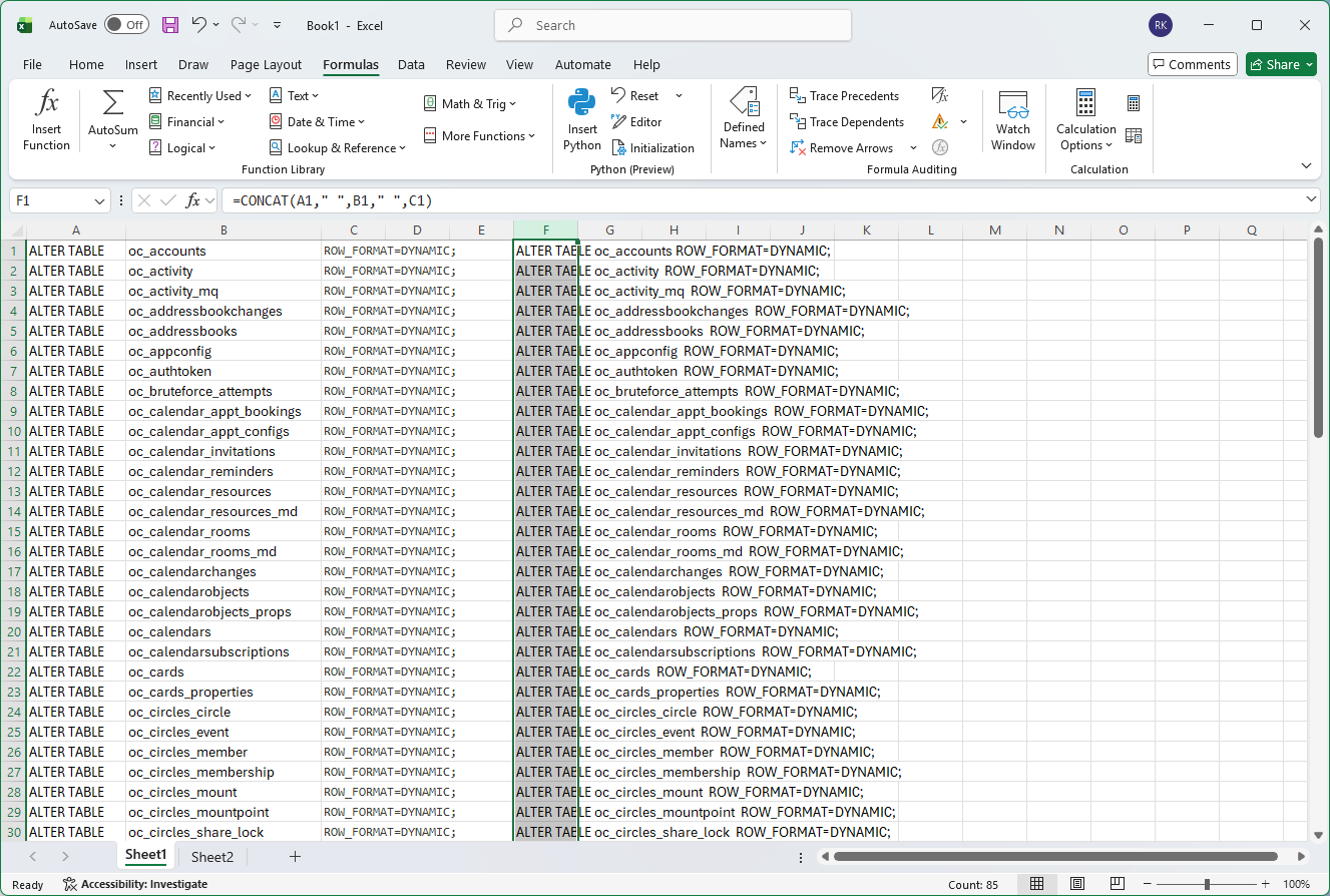 SELECT CONCAT(‘ALTER TABLE `’, TABLE_NAME, ‘` ROW_FORMAT=DYNAMIC;’)