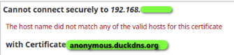 youāre trying to connect using the IP address (192.168.*.*). But a certificate is always bound to a domain name (anonymous.duckdns.org) and NEVER to an IP address.