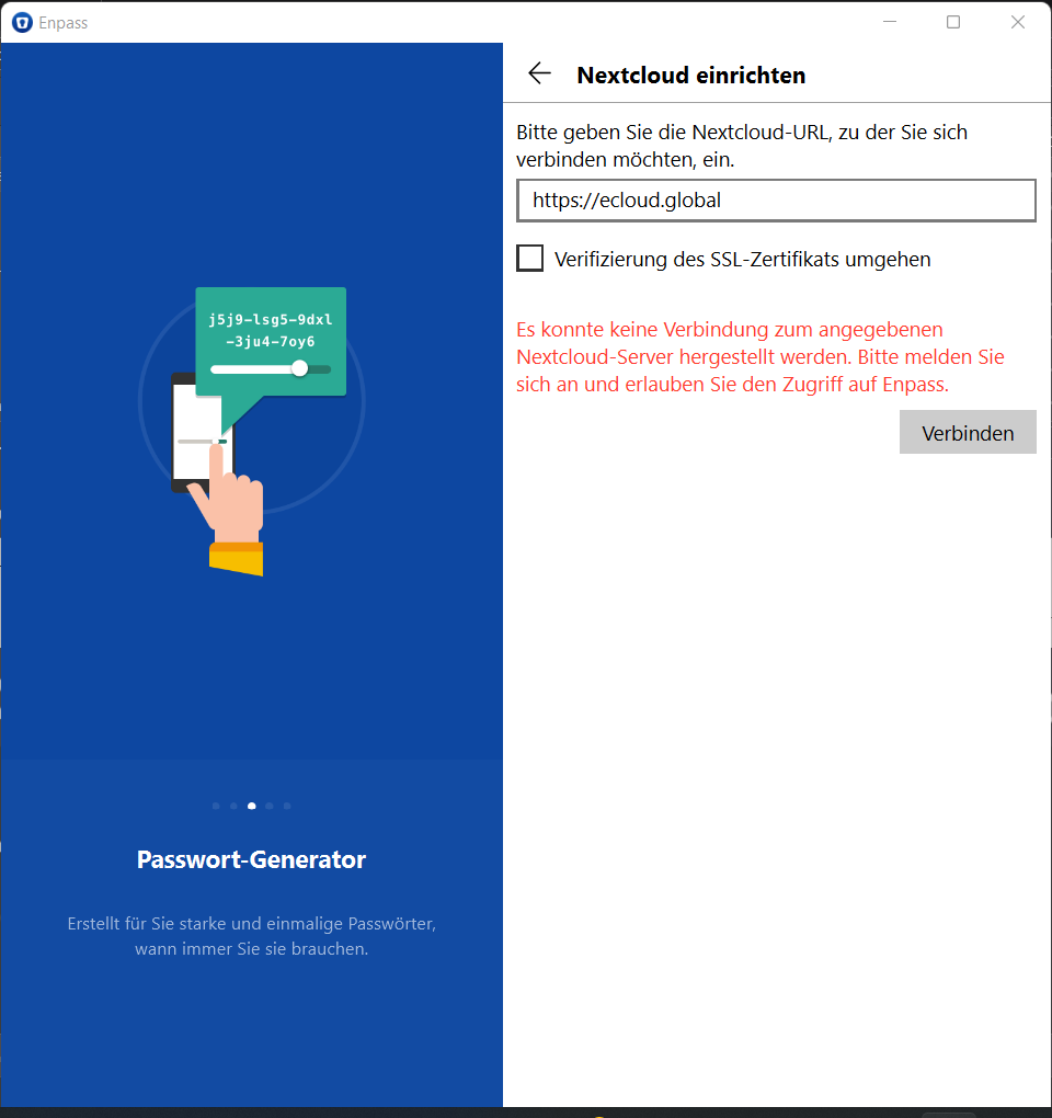Beim Versuch, mittels Neuinstallation der nextcloud app die Verbindung wieder herzustellen, erschien folgende Meldung, nachdem ich die URL https://ecloud.global eingegeben und auf “Weiter” geklickt hatte: