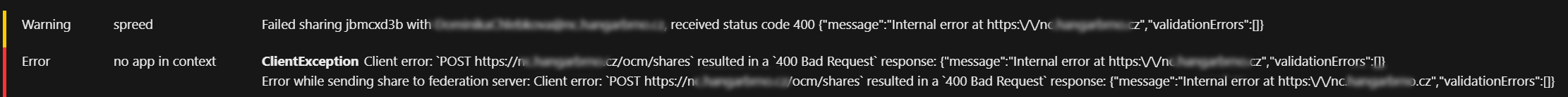 I have 2 freshly installed instances of nextcloud with the same configuration on 2 different sites (2 different domains) that I joined to federation. Both servers are added as trusted for federation and federation of files and folders seems to work, but creating federated conversation ends up with unspecified error. The log on each side says something slightly different.