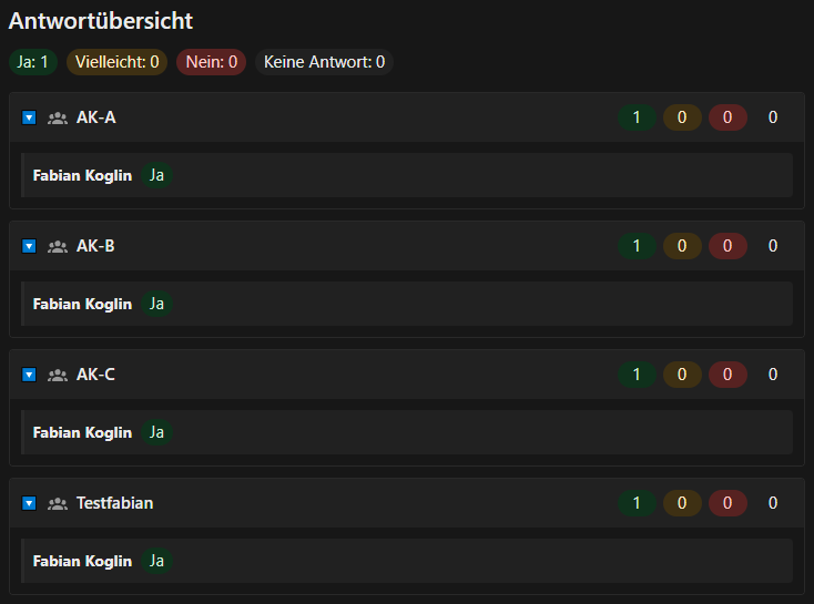 Kurz erklĂ€rt: Die App zeigt nicht nur, wie viele Leute zu einem Termin kommen - sondern auch aus welchen Gruppen. Also z.B. wie viele Soprane, Alte, Tenöre, BĂ€sse bei der Chorprobe dabei sind. Oder welche Positionen beim FuĂballtraining besetzt sind. Und man kann vor Ort auch einen âCheckInâ durchfĂŒhren um zu sehen, wer wirklich da ist.