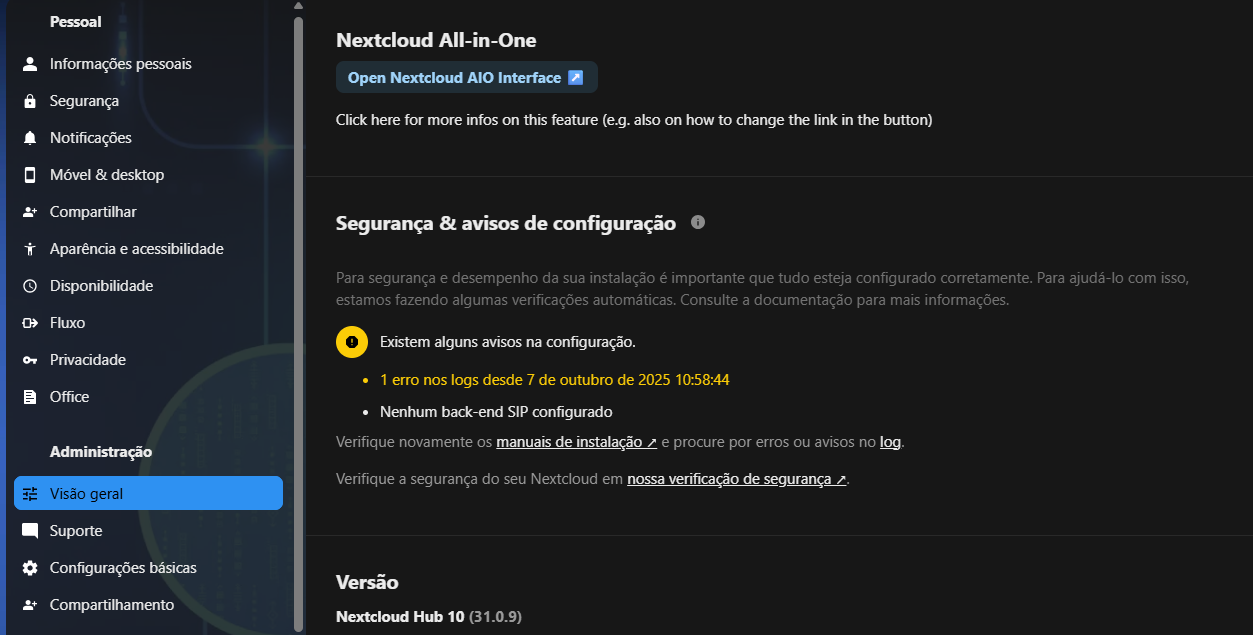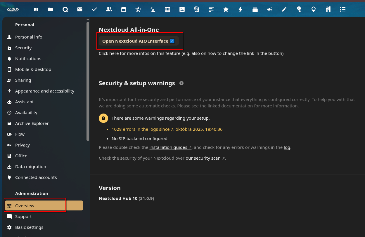 Since the installation was done via Docker, I understood that to update NextCloud to the new version 32, I need to access the administration part using port 8080.