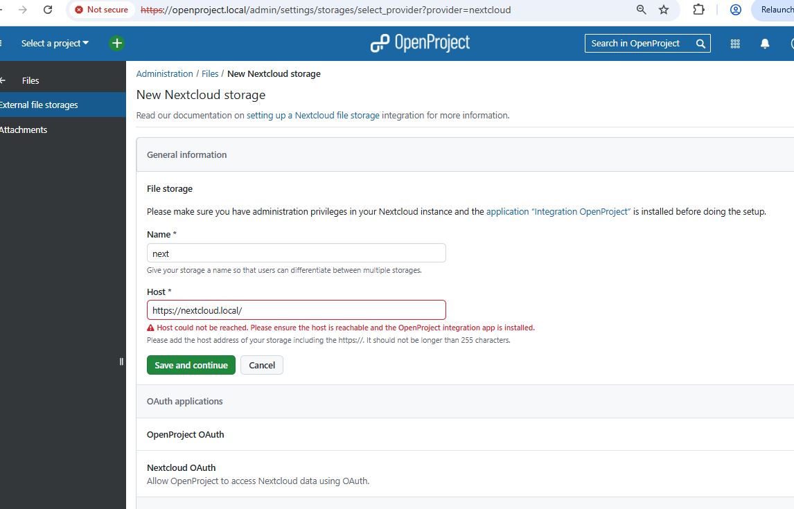 I am currently facing an issue when trying to connect OpenProject to Nextcloud for storage integration. When attempting to add Nextcloud storage in OpenProject (Administration → File Storages → New Storage), I receive the following error message: