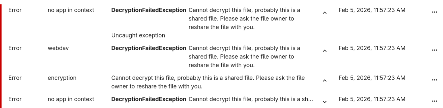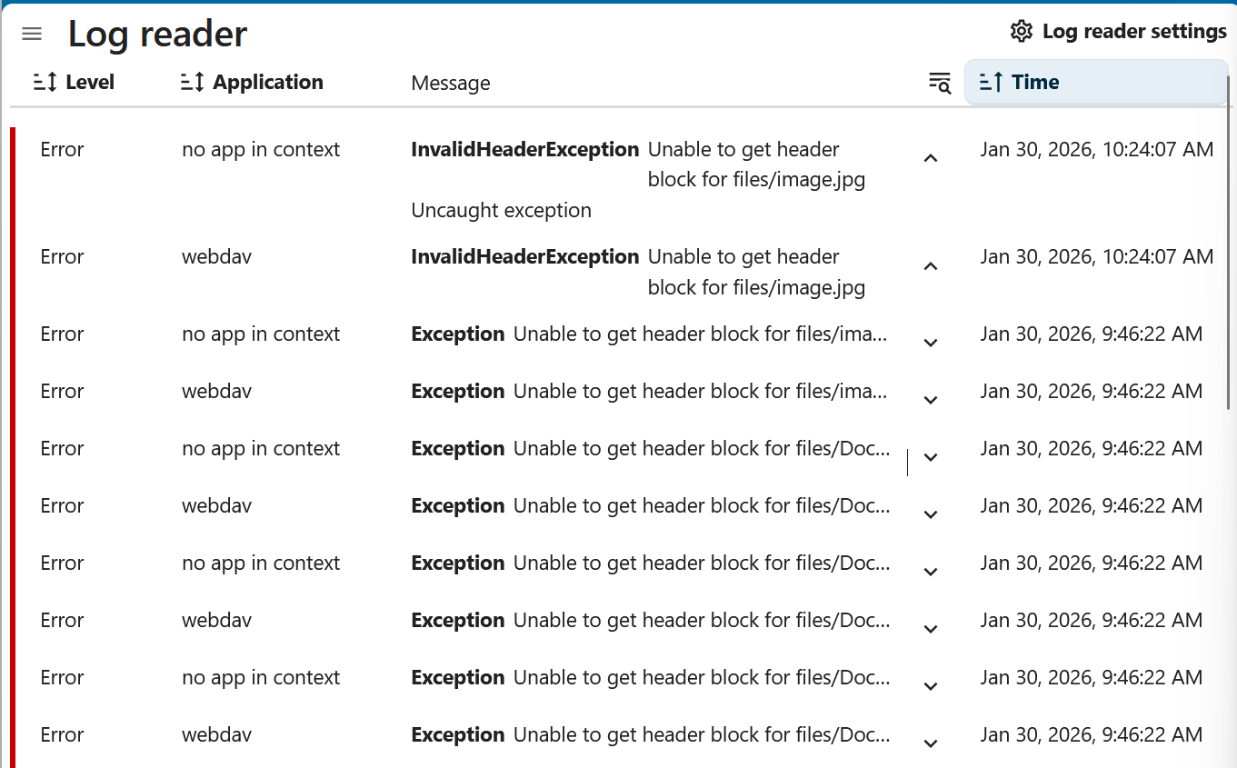 {"reqId":"3UHv4rxevASeoYeEPe7z","level":3,"time":"2026-01-30T09:47:06+00:00","remoteAddr":"192.168.178.130","user":"admin","app":"no app in context","method":"GET","url":"/remote.php/dav/files/admin/image.jpg","scriptName":"/remote.php","message":"Uncaught exception","userAgent":"Mozilla/5.0 (Windows) mirall/4.0.6 (build 20260122) (Nextcloud, windows-10.0.26200 ClientArchitecture: x86_64 OsArchitecture: x86_64)","version":"32.0.4.1","clientReqId":"120d658e-7959-4f4c-839c-6b335b51687f","exception":{"Exception":"Sabre\\DAV\\Exception","Message":"Unable to get header block for files/image.jpg","Code":0,"Trace":[{"file":"/var/www/html/apps/dav/lib/Connector/Sabre/File.php","line":465,"function":"convertToSabreException","class":"OCA\\DAV\\Connector\\Sabre\\File","type":"->","args":[{"__class__":"OCP\\Encryption\\Exceptions\\InvalidHeaderException"}]},{"file":"/var/www/html/3rdparty/sabre/dav/lib/DAV/CorePlugin.php","line":85,"function":"get","class":"OCA\\DAV\\Connector\\Sabre\\File","type":"->","args":[]},{"file":"/var/www/html/3rdparty/sabre/event/lib/WildcardEmitterTrait.php","line":89,"function":"httpGet","class":"Sabre\\DAV\\CorePlugin","type":"->","args":[{"__class__":"Sabre\\HTTP\\Request"},{"__class__":"Sabre\\HTTP\\Response"}]},{"file":"/var/www/html/3rdparty/sabre/dav/lib/DAV/Server.php","line":472,"function":"emit","class":"Sabre\\DAV\\Server","type":"->","args":["method:GET",[{"__class__":"Sabre\\HTTP\\Request"},{"__class__":"Sabre\\HTTP\\Response"}]]},{"file":"/var/www/html/apps/dav/lib/Connector/Sabre/Server.php","line":211,"function":"invokeMethod","class":"Sabre\\DAV\\Server","type":"->","args":[{"__class__":"Sabre\\HTTP\\Request"},{"__class__":"Sabre\\HTTP\\Response"}]},{"file":"/var/www/html/apps/dav/lib/Server.php","line":424,"function":"start","class":"OCA\\DAV\\Connector\\Sabre\\Server","type":"->","args":[]},{"file":"/var/www/html/apps/dav/appinfo/v2/remote.php","line":22,"function":"exec","class":"OCA\\DAV\\Server","type":"->","args":[]},{"file":"/var/www/html/remote.php","line":151,"args":["/var/www/html/apps/dav/appinfo/v2/remote.php"],"function":"require_once"}],"File":"/var/www/html/apps/dav/lib/Connector/Sabre/File.php","Line":603,"Previous":{"Exception":"OCP\\Encryption\\Exceptions\\InvalidHeaderException","Message":"Unable to get header block for files/image.jpg","Code":0,"Trace":[{"file":"/var/www/html/lib/private/Files/Storage/Wrapper/Wrapper.php","line":143,"function":"fopen","class":"OC\\Files\\Storage\\Wrapper\\Encryption","type":"->","args":["files/image.jpg","r"]},{"file":"/var/www/html/lib/private/Files/View.php","line":1210,"function":"fopen","class":"OC\\Files\\Storage\\Wrapper\\Wrapper","type":"->","args":["files/image.jpg","r"]},{"file":"/var/www/html/lib/private/Files/View.php","line":1038,"function":"basicOperation","class":"OC\\Files\\View","type":"->","args":["fopen","/image.jpg",["read"],"r"]},{"file":"/var/www/html/apps/dav/lib/Connector/Sabre/File.php","line":463,"function":"fopen","class":"OC\\Files\\View","type":"->","args":["image.jpg","r"]},{"file":"/var/www/html/3rdparty/sabre/dav/lib/DAV/CorePlugin.php","line":85,"function":"get","class":"OCA\\DAV\\Connector\\Sabre\\File","type":"->","args":[]},{"file":"/var/www/html/3rdparty/sabre/event/lib/WildcardEmitterTrait.php","line":89,"function":"httpGet","class":"Sabre\\DAV\\CorePlugin","type":"->","args":[{"__class__":"Sabre\\HTTP\\Request"},{"__class__":"Sabre\\HTTP\\Response"}]},{"file":"/var/www/html/3rdparty/sabre/dav/lib/DAV/Server.php","line":472,"function":"emit","class":"Sabre\\DAV\\Server","type":"->","args":["method:GET",[{"__class__":"Sabre\\HTTP\\Request"},{"__class__":"Sabre\\HTTP\\Response"}]]},{"file":"/var/www/html/apps/dav/lib/Connector/Sabre/Server.php","line":211,"function":"invokeMethod","class":"Sabre\\DAV\\Server","type":"->","args":[{"__class__":"Sabre\\HTTP\\Request"},{"__class__":"Sabre\\HTTP\\Response"}]},{"file":"/var/www/html/apps/dav/lib/Server.php","line":424,"function":"start","class":"OCA\\DAV\\Connector\\Sabre\\Server","type":"->","args":[]},{"file":"/var/www/html/apps/dav/appinfo/v2/remote.php","line":22,"function":"exec","class":"OCA\\DAV\\Server","type":"->","args":[]},{"file":"/var/www/html/remote.php","line":151,"args":["/var/www/html/apps/dav/appinfo/v2/remote.php"],"function":"require_once"}],"File":"/var/www/html/lib/private/Files/Storage/Wrapper/Encryption.php","Line":352,"Hint":"Unable to get header block for files/image.jpg"},"message":"Uncaught exception","exception":{},"CustomMessage":"Uncaught exception"}}