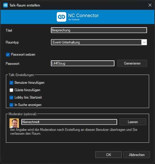 - Benutzer: interne Nextcloud-Benutzer werden direkt dem Raum hinzugefügt.