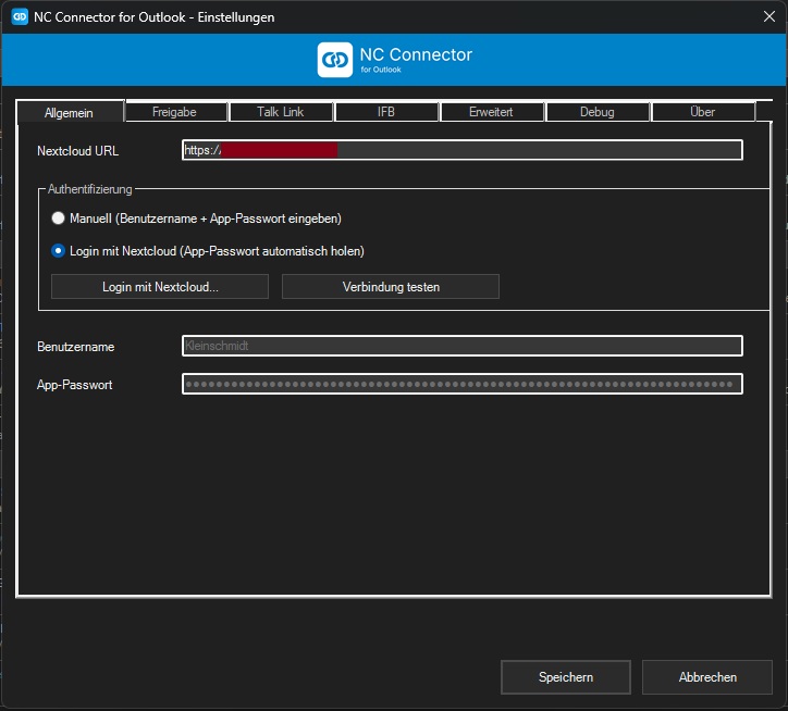 Im Debug-Tab aktivierbar. Schreibt strukturierte Logs (Authentifizierung, Termin- und Filelink-Flows, IFB) nach%LOCALAPPDATA%\NextcloudTalkOutlookAddInData\addin-runtime.log. Der Speicherort wird im UI angezeigt.