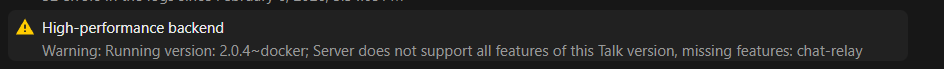 I did running on Package aio-talk · GitHub Unless doing something wrong running it on docker Warning: Running version: 2.0.4~docker; Server does not support all features of this Talk version, missing features: chat-relay